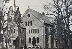 The parish and the school grew quickly in the early years, and Father Haarth initiated a major remodeling (underway by spring of 1908) to accommodate, nearly razing the original building and replacing it with a Gothic structure that could serve as both church and school. The school portion, in the same Gothic style adjoined the church on the east side, on Tower Road.[4]