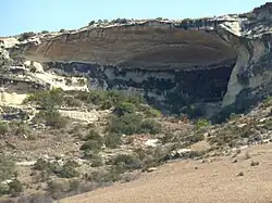 The Motouleng caves, meaning 'place of beating drums', are located in the mountains of the eastern Free State and Lesotho, between Clarens and Fouriesberg. The large cave was created in a limestone mountain by a rock fall. A small river and pools lie below the cave.[3] There is a fountain at the entrance of Motouleng called 'Sediba sa Bophelo', meaning 'The Fountain of Life' where people drop coins for good fortune. The cave is a 2 km hike from the nearest farm, which is located 15 km out of Clarens. Locals go as they please while visitors are required to attend guided tours to ensure respect for the ancestors. Women are required to wear long skirts and cover themselves up out of respect.[2]
