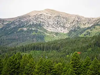 Saddle Peak is the sixth-highest peak in the Bridger Range which is a subrange of the Rocky Mountains.[1] The peak is situated nine miles (14 km) north of Bozeman in the Gallatin National Forest. Precipitation runoff from the mountain's slopes drains into tributaries of the East Gallatin River. Topographic relief is significant as the summit rises 3,160 feet (963 meters) above Slushman Creek in 1.5 miles (2.4 km). This mountain's descriptive toponym has been officially adopted by the United States Board on Geographic Names.[3]