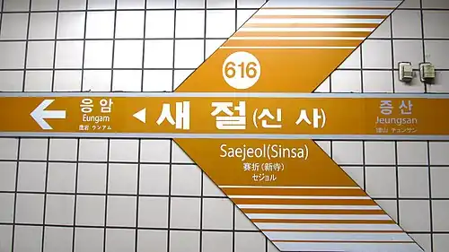 Saejeol Station is a railway station on Line 6 of the Seoul Subway. It was originally planned to be called Sinsa Station, but the name was changed due to possible confusion with the pre-existing Sinsa station in Gangnam-gu, on Line 3.[1][2]
