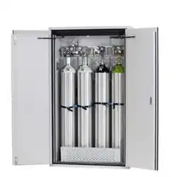 Safety cabinets to BS EN14470-2 for pressurized gas cylinders, are designed to accommodate cylinders in working areas. The gas is supplied to the desired application via a pipeline through pipe lead-throughs in the roof of the cabinet. These pipe penetrations must be sealed to ensure fire protection. Many pressurized gas cylinder cabinets are also fitted with "rolling ramps" which are inserted into the door or can be folded out so that the fire protection seals are not damaged when the cabinet is loaded.[4]