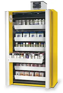Safety cabinets usually consist of the following components: inner body, fire protection insulation, outer body, fresh air inlets and exhaust air connection points with auto shut-off, automated closing mechanisms for the doors in case of fire (not with gas cylinder cabinets), heat-triggered self-expanding seals (intumescent) on the doors and optionally, an earth connection.[3] Safety cabinets to BS EN14470-1 for flammable substances, usually have storage shelves or pull-out drawers on which the chemicals are stored. The shelves or drawers should be load-tested and be able to support the loading specified by the manufacturer. To ensure the retention of accidental spillages within the cabinet, the cabinet must be equipped with spill containment sumps.