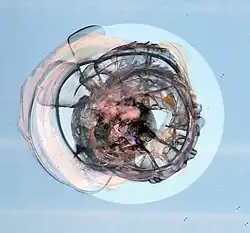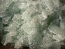 Laminated glass is composed of layers of glass and plastic held together by an interlayer.[8] When laminated glass is broken, it is held in place by an interlayer, typically of polyvinyl butyral (PVB), between its two or more layers of glass, which crumble into small pieces. The interlayer keeps the layers of glass bonded even when broken, and its toughening prevents the glass from breaking up into large sharp pieces.[9] This produces a characteristic "spider web" cracking pattern (radial and concentric cracks) when the impact is not enough to completely pierce the glass.[10]