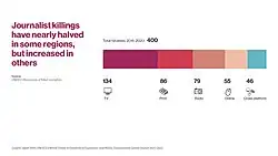 The UNESCO's study World Trend Report in Freedom of Expression and media development: Global Report 2017/2018, has found that over the past five years, 113 freelance journalists were killed, representing 21% of the total of the journalist killed.[9] It has been considered that freelance journalists are particularly vulnerable, often working alone on stories, in dangerous environments, and without the same level of assistance and protection as staff-journalists.[10] The past few years, the trend has been confirmed, in fact the Report of the Organization's Director-General on the safety of journalists and the dangers of impunity of 2022 has found that for the period 2020–2021, around 1/5 of all journalist killings were freelance journalists. The study establishes that 11 freelance journalist killings were recorded in 2020, representing 18% of all killings and 11 in 2021 representing 20% of the killings.[11]