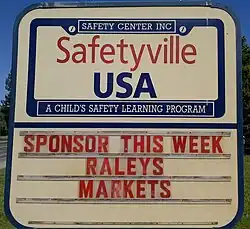 Safetyville, USA is part of the non-profit[1] Safety Center, Inc.'s Children's Safety Program, which provides life-saving safety skills and awareness education. The one-third scale town features real sidewalks, crosswalks, streetlights, a police, fire and sheriff station, and businesses commonly found in any city, including McDonald's and Taco Bell.[2][3] In June 1998, Dick Cable, a professional broadcaster for KXTV, became the Honorary Mayor of Safetyville. Cable was the first Sacramento broadcaster to win an Emmy award.[4]