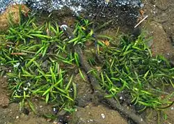 It is a perennial, aquatic plant with an underwater, thick horizontal root about 5–10 centimetres (2–4 inches) long and 6 millimetres (1⁄4 in) thick. This particular species grows in the cracks in stream beds. Each leaf arches upward and is 5–10 cm long with a pointed tip.