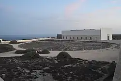 - Fortress of Sagres (Portuguese: Torre e muralhas de Sagres/Fortaleza de Sagres), Henry the Navigator ordered the construction of this fortress to protect the strategic coastal position at Ponta de Sagres, and the coves that sheltered shipping. The church of Santa Maria, consecrated in 1519, to the invocation of Nossa Senhora da Graça (Our Lady of Grace) was constructed at the centre of the site, during the reign of King Manuel I of Portugal.[8] A valuable gilded altarpiece from the Chapel of Santo António (in the fort of Beliche), and two images of Saint Vincent and Francis of Assisi, from the 17th and 18th century.[8] The fortification was remodeled in the 16th, 17th and 18th century, after various attacks (including an assault by Francis Drake in 1587); its current form dates to 1793.[8]