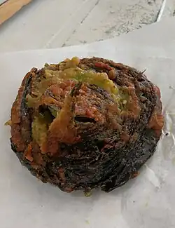 For the easier preparation method of "cut-up", dasheen leaves are cut into small pieces, mixed with dough, formed into palm-sized cakelets, and fried in oil or fat.[8] The cut-up method is the one mainly found at food stalls.[5] An even simpler preparation method for cut-up saheena involves mixing minced dasheen leaves, water, and industrial pholourie dough and frying it in portions.[6]