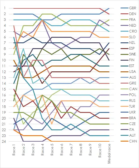 | 24 | Gong Lei | OCS 25 | 17 | 20 | 22 | OCS 25† | 16 | 22 | 23 | 21 | 24 | 215.0 | 190.0 |