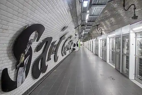 Since the métro's centenary in 2000 and until 2016, the station's platforms have had numerous temporary exhibitions on the history literature in the neighbourhood.[1] The platforms also had displays that presented the stories of young literary talents.