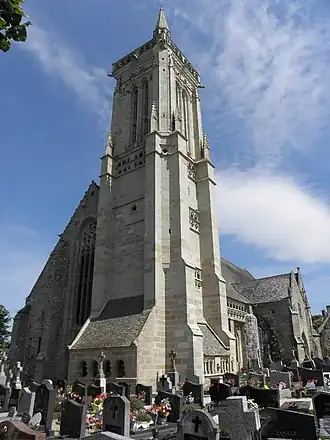 The Gothic "Chapelle de l'Isle" dates to between 1507 and 1513. The church has two octagonal fonts dating to the 16th century. The stained glass windows are modern and are by the Orléans's artist Louis-René Petit, and were unveiled by the Bishop of Quimper on 24 June 1990. They depict scenes representing Christ's baptism and Transfiguration in the large chevet window, the Tree of Jesse for the window in the "Chapelle de l'Isle", and the Apocalypse in the bay by the south porch.[3] The church holds several "Enfeus", these being fireplace-like structures which indicate the presence of tombs behind the wall where they appear.[3] The church has a fine oratory and, apart from John the Baptist's finger, possesses a silver reliquary dating to the 16th century said to contain the head of Saint Mériadec and another said to contain the arm of Saint Maudet.[6] On 5 November 1955, the church suffered a major fire and several priceless works of Breton art were lost, including the altarpiece on the main altar dating to 1670 and the altarpieces by Lespaignol dedicated to Saint Mériadec and Saint Elizabeth dating to 1723. A rood screen ("poutre de gloire") dating to 1571 was also lost.