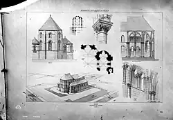 Saint-Julien-le-Pauvre was begun during the creation of Gothic style under the rule of King Louis the Younger, showing that the same principles of a style, under different economical conditions, can have different outcomes.[4] The only one of the city's twelfth-century parish churches to have endured,[4] it was never completed in its original design: the choir area was intended to be three stories high, and the clerestory is an incomplete triforium; the nave was supposed to be covered by sexpartite vaults, which were replaced by a wooden roof and, after the 17th century, by a new system of vaults; and, of a tower meant to stand on the church's southern side, only the staircase was begun.[3] The eastern apses use material from an older building.[3]