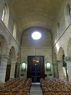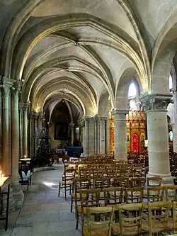 The influence of Notre-Dame-de-Paris, built at the same time, is visible in the architecture of the interior of the church, particularly in the vaults and the columns and pillars in the nave and choir. The 13th-century nave is flanked by two lower aisles. and lined with arcades of columns supporting pointed arches. The columns have capitals decorated with sculpted water lilies and other aquatic plants. The choir is older (12th century) and is a good example of the early Gothic style. It is covered with early six-part rib vaults, while the nave has the simpler, stronger four-part vaults. One 12th century column is decorated with sculptures of harpies, mythical half-woman, half-bird creatures popular in Romanesque architecture.[10]