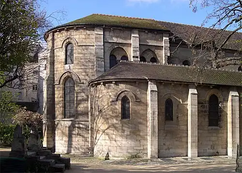 The new church was begun between 1165 and 1170 upon the foundations of the older church. It was built under King Louis VII, the founder of the University of Paris, and of Notre-Dame de Paris.[6] It is thirty years younger than the Saint Pierre de Montmartre church, the construction of the famous Gothic ambulatory of the Basilica of Saint-Denis lay between them.[4][3] It was inspired by the contemporary Notre Dame de Paris.[3] The building effort was supported by the Clunaic monastic community of Longpont. Their enterprise resulted in the completion of the choir and, most likely, the nave (ca. 1210–1220).[3]
