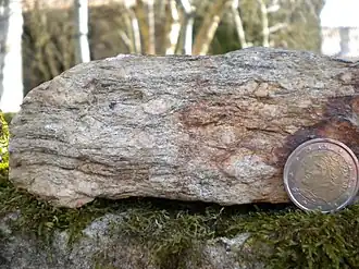 On its western side the upwarp is traversed by a North-South-striking fault zone, which separates the Piégut-Pluviers granodiorite from the paragneisses. This fault zone starts at Lacrète (commune of Étouars) in the South and terminates just south of Massignac in the North.
