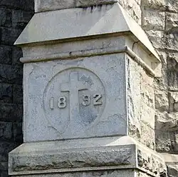 The cornerstone for the present church building was laid on July 4, 1892, and the first mass was celebrated at Easter in the new church in 1903. The new St. Augustine church was built in the Gothic Revival style of rusticated gray Vermont granite, with a slate roof, and a detached circular vestry in the northeast corner. The original interiors were rich in finish, with elongated neogothic columns, lancet arches, polychrome stenciling on walls and ceilings in warm gray, madder rose, olive green and gold; stained glass, and paintings by Vermont artist Thomas Waterman Wood. A large central altar was flanked by two smaller side altars and the podium was located midway in the nave. The local newspaper at the time, the Montpelier Daily Journal, said of the newly constructed place of worship, "They have built a sanctuary that will be a joy and an inspiration not only to them, but to their children and their children's children for generations to come."[3] The south facade has three entries; above the center entrance is a large rose window with a lancet pediment. Two towers flank the central entrance. The taller tower, on the eastern side, was not completed as designed. Instead of having a spire and parapet, it was capped with a low hip roof.