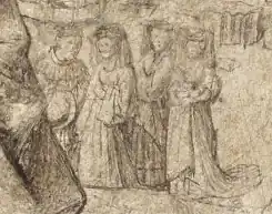 Three women behind and to Barbara's left are seen visiting the construction, each wearing similar houppelandes. The woman in the centre raises her skirt to show her kirtle. They are each wearing a headdress, probably burlets with ruffled golets draped from the head.[7]