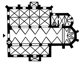 When the rest of the Romanesque church was demolished, the western part of the main nave with the front wall was finished, which interconnected the western part of the double nave. Meanwhile, at the east side of the church in front of the double-nave, the sacristy was built as an additional part of choir. The change of plans was discovered mainly because of style change of the double nave, and also because of the situation above the vault under the ceiling. New solution for the building was convergence of supporting arcade pillars, which created characteristic T-shape. This resulted in wall pressure relief above arcades between naves which holds the weight of the vault.