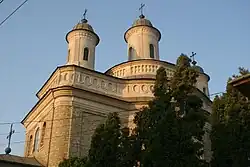 There was a graveyard outside the church; part of the remains were disinterred after Eternitatea cemetery was established in 1871, an exception being Gheorghe Leondari, who was buried there after his death in 1835. A hundred years later, his remains were placed in the church, on the right side of the nave.[2] Also in 1935, the church was blessed a second time by Metropolitan Nicodim Munteanu. An athenaeum associated with the church was built in the yard in 1934.[2] This hosted cultural figures, among the most popular speakers being philosopher Ion Petrovici.[1] It was destroyed during World War II.[2] After the 1977 Vrancea earthquake, the damaged spires were rebuilt in 1997-1998 and the interior repainted in 1987-1989.[1][2] During the same period, the Miclăușeni Monastery donated part of Saint Charalambos' relics to the parish. Following the Romanian Revolution, a bakery and food pantry were established at the church.[1]