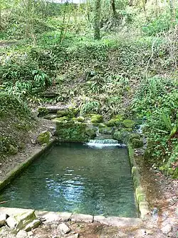 During this time, various structures were built around the well and bath to accommodate the many pilgrims. Browne Willis wrote in 1721 that there were rooms for changing into bathing clothing and other buildings; one was said to be a chapel which had images of the 12 Apostles in its lower half.[14][19][26] Thomas Pennant said the fountain was "inclosed in an angular wall decorated with human figures and before it is the well for the use of the pious bathers".[27][28][e] In later times the well and its surroundings fell into neglect. Richard Fenton's 1808 visit to the well found that the building which formerly enclosed the bath had fallen in and was ruined with the "bath choaked up".[25][24] By 1880 little evidence of the former buildings on the site remained.[18] Attempts were made to revitalise the site; some bridges were built over the stream and small statues were again brought to the area surrounding the well.[3] The well remains a popular place for pilgrims; some churches have visited the well to conduct baptisms using the water of the well.[3] The site of the well was named a Grade II Listed Building in the National Historic Assets of Wales, on 29 November 1999.[24]