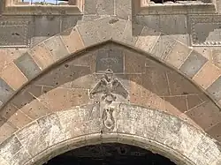 An airy, triple-arched portico was added to the western façade of the church in 1683 as the burial place for prominent Armenian clergymen. The gallery is made up of five distinct yet continuous bays, each being open and linked to the one adjacent. Its three central bays have vaulted ceilings and large arched openings that lead to the exterior courtyard. The two side bays are slightly lower in height and are vaulted as well. Each is surrounded by walls at three sides with small quatrefoil windows placed on the exterior walls. Frescos of clergymen adorn niches along the interior walls of the portico while saints are depicted on the fresco of the tympanum above the main door. Six-columned cupolas sit on the roof above the two end bays and may be seen from the exterior.