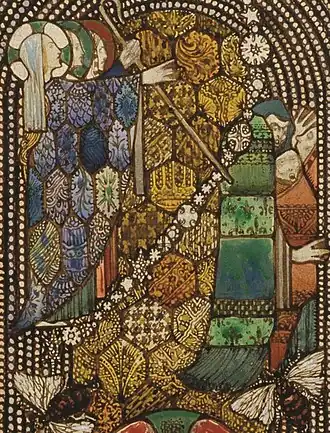 St. Gobnait is shown in profile with a pale, thin and ascetic face and is given individualistic, unmistakable features. She wears royal blue and purple robes adorned with lozenged jewels, a veil and a silver cloak.[10][11] The window's borders are lined with beaded decorations in ruby and blue.[4] Her clothing draws from Léon Bakst's costume for Ida Rubinstein's 1911 performance of "Le Martyre de saint Sébastien".[12] Highly detailed and complex floral patterns run along the outer borders of each of the window's registers.[13]