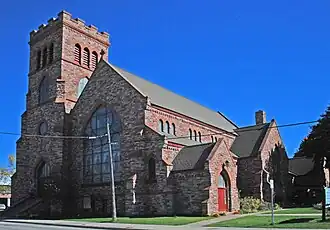 St. James' Episcopal Church is a Late Gothic Revival structure built in a cruciform plan.[3] A square tower sits at one front corner. The exterior walls are constructed of red-brown sandstone with red sandstone trim. Groups of three arched windows are located in the clerestories The street front and transepts each contain a large Gothic-arched window.[3]