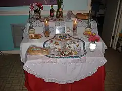 One prominent custom is the Saint Joseph's Day altar, which are elaborately decorated with figurines, medals, and votive candles. The altar is divided into three tiers, representing the three persons of the Trinity, with a statue of Joseph at its head. The tables are dressed with food, which is donated to the poor on the solemnity.[31] On the altar, people place flowers, limes, candles, wine, fava beans, specially prepared cakes, breads, and cookies (as well as other meatless dishes), and zeppole. Foods are traditionally served containing bread crumbs to represent sawdust since Joseph was a carpenter. Because the feast occurs during Lent, traditionally no meat was allowed on the celebration table.[32]