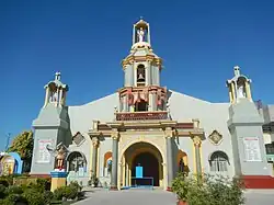 The façade of the church is generally described as that of Renaissance-style, sporting different architectural features not commonly found incorporated in one structure. The central focus when viewing the façade is the central bell tower with its base supported by semicircular arches, Doric columns supporting the first and third levels, scroll-like ornamentations, and balustraded second level. The façade expands horizontally, with bare walls punctured by rose windows and semicircular arch windows, and ends with huge rectangular buttresses topped with religious images cased inside urnas or canopied niches. The year 1923 is inscribed in the façade, referring to the repairs made during the time of Monsignor Zabala.[1][2]