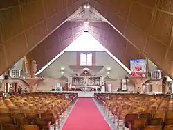 The temple's architecture, in contemporary style, was inspired by the Tokyo Cathedral which was based on the tents that served as mobile sanctuaries in the desert described in the biblical passage from Exodus (26:14).[12][8] Its structure is made of structural masonry in concrete blocks and its main facade, facing east to São Sebastião Street, in the Santa Helena neighborhood, has the similar shape of an isosceles triangle, whose side edges do not reach the ground. The side facades, in turn, are composed of three isosceles triangles. The colored stained glass windows located between the iron columns and the roof are also striking features, representing biblical passages at the ends of each of the triangles.[7]