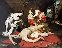 The subject, especially in the depictions where Sebastian has been got clear of his post or tree, has clear similarities to two other scenes from secular Italian epic romances: Angelica and Medoro from Orlando Furioso by Ludovico Ariosto (1516) and Erminia and Tancredi from Gerusalemme liberata by Torquato Tasso 1581. In both of these the hero is wounded in battle, and nursed by his lover; the scene from Tasso was especially popular as a subject, often as part of a cycle.[23] In both the heroes are usually shown sprawled and largely unclothed, their armour often being shown discarded near them, which is also a feature of some Sebastians.[24] There is a painting of the Ariosto subject by Simone Peterzano, who died in 1599, but most treatments of both subjects come from the same broad period after about 1620 as those of Sebastian and Irene. The compositions where Sebastian remains semi-upright as the women untie him inevitably recall the subject of the Descent from the Cross of Christ.[25]