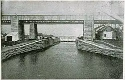 Since the completion of the second canal, the Sainte-Anne-de-Bellevue Canal and the other canals of the Ottawa River were mainly used to transport wood to Montreal. This commerce flourished until 1919 whereafter the logging industry went into decline. From 1920 to 1963, shipments of sand, gravel and petroleum products became the principal freight transported. In 1914, electric lighting was installed, and in 1923, the gate mechanisms were electrified. But the railroad supplanted water transportation and the canal lost most of its importance. In the 1960s, a period of modernization saw the removal of many old service buildings, such as the toll collector’s residence and office, smithy, carpentry shop, storehouse, and tool shed. The lock’s old wooden gates were replaced with steel ones and in 1964, the old 1843 canal and locks were completely backfilled.[3][4]