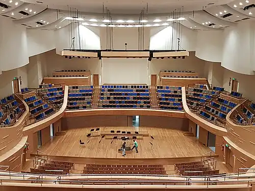 The architectural and acoustic design of Sala Minas Gerais brought together concepts from several well-known venues, such as the Berliner Philharmonie (belonging to the Berlin Philharmonic Orchestra) and the Sala São Paulo, but with no pre-established model.[4] The Room's armchairs were purpose-designed and built, being an integral part of the hall's acoustic performance through its acoustic absorption.The audience's distribution around the stage, in front of it and on terraces around it, favors both visual and auditory aspects.[2] Other acoustic elements in the room include ceiling diffusers, which can vary in height and angle according to the conductor's instructions, as well as the sail-shaped walls.[8]