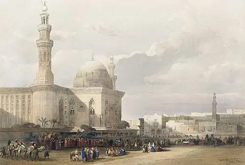 The square is surrounded by the Mosque-Madrasa of Sultan Hassan to the north, the Al-Mahmoudia Mosque to the east. The Al-Rifa'i Mosque, a 19th-century addition, contains the tombs of four 19th and 20th century Khedives and Kings of the Muhammad Ali dynasty.[1]