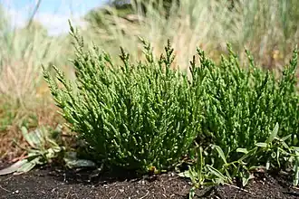 Salicornia europaea, known as marsh samphire,[2] common glasswort[3] or just glasswort, is a halophytic annual dicot flowering plant. Other common names include pickle weed, saltwort, and chicken toe (due to the shape).[4] It is a succulent plant with high water content, accounting for its slightly translucent look (the source of the name 'glasswort'). It is found near saline water in Europe and is edible both raw and cooked.