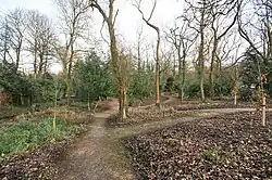 Salisbury Woodland Gardens is an open space located in the east of Blackpool, flanked by East Park Drive and Woodside Drive and linking Blackpool Zoo with Stanley Park.[1] Known simply as the 'Woodland Gardens' to local people,[1] the site was acquired in 1924 by Blackpool Corporation and was originally developed as a shelter belt for the adjacent Stanley Park Golf Course. The gardens were later developed in the 1940s as an arboretum and public open space for all to enjoy. It was renovated in 1967 by Peter Perry and his 'Flying Squad (see below). Popular once as a wedding photograph location, the site went into decline during the 1990s. The council's Ranger Service manage and protect the gardens[2] which they took over in September 2006 and have been funding and undertaking the restoration of the woodland. In 1967, Parks Director Norman Leach appointed gardener Pete Perry and his Flying Squad of gardeners to plant up the gardens. All plants, (primulas, meconopsis, etc.) were grown from seed in the greenhouses at Stanley Park, and planted en masse. Extra shrubs, including azalea were also planted.