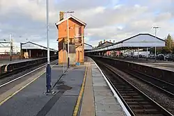 The LSWR station was again enlarged between 1899 and 1902, and the 1870s platform east of Fisherton Street could then be closed.[5] Two new platforms serving three tracks were opened between the GWR platforms and the original LSWR one, reached by a subway from the LSWR's new station offices, which were built in red brick on the west side of their original building of 1859.[3]