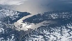 ![]() The Salish Sea, showing the open Pacific Ocean at lower left, and from there, heading inland: the Strait of Juan de Fuca, the narrow Puget Sound at lower right, and the wide Strait of Georgia at upper center. Sediment from the Fraser River shows as a greenish plume in the Strait of Georgia. | |