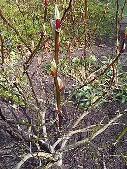 Growing to 3 m (9.8 ft) in height, it is a spreading deciduous shrub with prominent new green growth which turns a shiny brown in its second season. Bright red buds appear in winter, followed by erect catkins. The leaves are glossy green on the upper (abaxial) surface, and dull grey on the lower (adaxial) surface. It has gained the Royal Horticultural Society's Award of Garden Merit.[2][3]