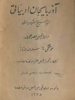 For the first time in history, Salman Mümtaz had published 16 books titled Azerbaijani Literature, focusing on the works of Azerbaijani classical authors.[23] The first of these 16 books was published in 1925 and was dedicated to the works of Agha Mesih Shirvani.[23] Salman Mümtaz referred to writers such as Hasanoghlu, Kadi Burhan al-Din, Shah Ismail Khatai, and Fuzuli as "the five-pointed star of our educational heavens."[24] He highly valued the works of these poets written in their native languages, researched their legacy with great affection, and discovered many unknown works of these writers. Mümtaz also spoke for the first time about poets like Habibi, Ənvəroğlu, and İsmayıl bəy Qutqaşınlı, among many others, in the history of literature. Additionally, he was the first to identify the authors of many works and prepared the manuscripts of numerous poems for publication.[24] Salman Mümtaz's books on Govsi Tabrizi (1925), Gasim bey Zakir (1925, 1936), Molla Panah Vagif (1925, 1937), Nasimi (1926), Mirza Shafi Vazeh (1926),[25] Vidadi (1936), and others were the first collections published on these poets.[26]
