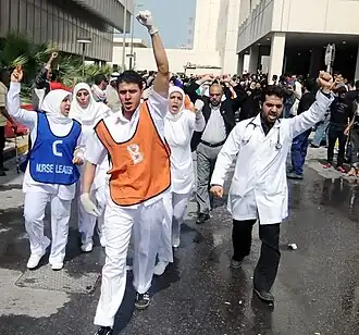 In March and April 2011, twenty health workers, primarily from Salminya, were arrested on a variety of felony charges for their actions during the protests, while an additional twenty-eight were arrested for misdemeanors.[9] Dr. Ali Al-Ekri was arrested while performing surgery at Salmaniya Medical Complex.[10]
