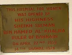Healthcare in Bahrain during the first half of the 20th century was predominantly supplied by the private American Mission Hospital, the small government hospital at Noaim (currently Noaim health centre) and Awali hospital. To cope with a largely increasing population, Salmaniya Medical Complex was opened in 1957 with a total capacity of 50 beds. The hospital underwent numerous expansions throughout its history; in 1977, the Emir of Bahrain Isa bin Salman Al Khalifa opened the first major expansion of the complex, which consisted of several new buildings which increased the hospital's total capacity to 470 beds. Further expansion in 1987 increased the total bed count to 617 beds. In 1997, a large expansion of Salmaniya was opened and included 20 new wards, which increased the total bed count to 926 beds.[2] In 2014, a 90-bed unit dedicated to hereditary blood disorders including Sickle Cell Disease was established.[4] During the midst of the 2020 COVID-19 pandemic in Bahrain, a 100-bed expansion of the emergency department was opened at the cost of 120,000 BHD.[5]