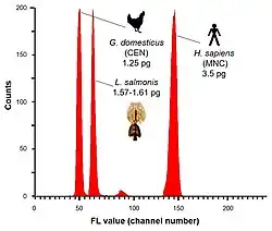 Two cytometric techniques, flow cytometry (FCM) and Feulgen image analysis densitometry (FIAD), gave measurements of 1.3–1.6 Gigabase pairs (Gb) in the haploid genome corresponding to a nuclear DNA weight of 1.35-1.61 picograms (pg) with differences between sexes.[25] FIAD derived estimates were of 1.35 and 1.45 picograms (pg) DNA while FCM analyses estimated a size of 1.57 and 1.61 pg for adult females and males, respectively. Male genome size has been shown to be consistently slightly larger than female genome size due to erosion of the W-chromosome in the heterozygotic female.[26]