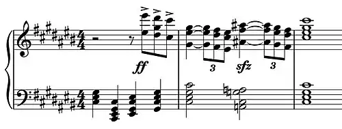 In the final scene of the opera, after Salome kisses Jochanaan's severed head, the music builds to a dramatic climax, which ends with a cadence involving a very dissonant unorthodox chord one measure before rehearsal 361. This single chord has been widely commented on. It has been called "the most sickening chord in all opera", an "epoch-making dissonance with which Strauss takes Salome...to the depth of degradation", and "the quintessence of Decadence: here is ecstasy falling in upon itself, crumbling into the abyss".[18] The chord is often described as polytonal, with a low A7 (a dominant seventh chord) merged with a higher F-sharp major chord. It forms part of a cadence in the key of C-sharp major and is approached and resolved from C–sharp major chords. Not only is the chord shockingly dissonant, especially in its musical context and rich orchestration, it has broader significance due in part to Strauss's careful use of keys and leitmotifs to symbolize the opera's characters, emotions such as desire, lust, revulsion, and horror, as well as doom and death. A great deal has been written about this single chord and its function within the large-scale formal structure of the entire opera.[19]