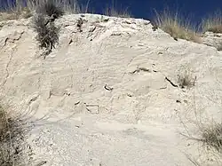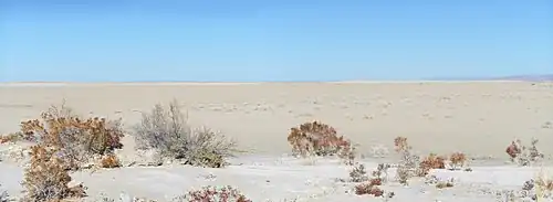 Just outside the community, there is a dry salt pan called Salt Flat Playa or Salt Basin. It straddles the New Mexico-Texas border and is approximately 150 miles long, and five to 15 miles wide, making it one of the largest gypsum playas in the United States. The playa occupies the north-south oriented Salt Basin Grabben, which lies between the Guadalupe and Delaware Mountains on the east and the Sierra Diablo and Diablo Plateau on the west. The playa was originally a lake during the late Pleistocene epoch, but drying of the climate since then has left a salt pan.[4] Today, a briny water table is about three feet below the surface. Capillary evaporation in the dry, hot weather pulls brine upwards and evaporite (gypsum, halite) and carbonate (calcite, dolomite) minerals precipitate.[4] Cyanobacteria (blue-green algae) grow on the surface and immediately below the surface when the playa is wet. Alternating light and dark bands are either gypsum-rich (light) or dolomite-rich (dark)[5] When the playa is dry during the summer, winds blow the gypsum into sand dunes.