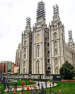 The Salt Lake Temple is a temple of the Church of Jesus Christ of Latter-day Saints on Temple Square in Salt Lake City, Utah, United States. At 253,015 square feet (23,505.9 m2), it is the largest Latter-day Saint temple by floor area. Dedicated in 1893, it is the sixth temple completed by the church, requiring 40 years to complete, and the fourth temple built since the Mormon exodus from Nauvoo, Illinois, in 1846.[3] The temple was closed in December 2019 for a general remodelling and seismic renovations, which were initially estimated to take approximately four years.[4] Subsequent updates[5][6] extended the estimated completion to 2026, for a total renovation timeline lasting an anticipated six or seven years.