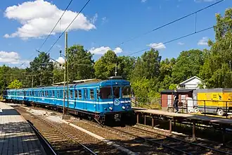 Saltsjöbanan (lit. 'the Salt Sea Line') is an electrified suburban rail system between Stockholm and Saltsjöbaden in Nacka, Sweden. It is 18.5 kilometres (11.5 mi) in length and has eighteen stations in use. An average of 17,200 boardings are made on an ordinary workday (2019). The line is mostly single-track (with passing loops between Nacka and Saltsjö-Järla, and between Storängen and Saltsjö-Duvnäs), and is isolated from Sweden's national railway network, although both are built to compatible 1,435 mm (4 ft 8+1⁄2 in) standard gauge. The Storstockholms Lokaltrafik (SL) classifies it as "light rail" in its maps.[4]