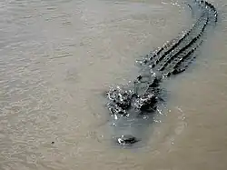 Like most species in the crocodilian family, saltwater crocodiles are not fastidious in their choice of food, and readily vary their prey selection according to availability. Nor are they voracious, as they are able to survive on relatively little food for a prolonged period. Because of their size and distribution, saltwater crocodiles hunt the broadest range of prey species of any modern crocodilian.[98] The diet of hatchling, juvenile, and subadult saltwater crocodiles has been subject to extensively greater scientific study than that of fully-grown crocodiles, in large part due to the aggression, territoriality, and size of adults that make them difficult for biologists to handle without significant risk to safety, for both humans and the crocodiles themselves. The main method used for capturing adult saltwater crocodiles is a huge pole with large hooks, meant for shark capture, that restrict the crocodile's jaws, but these can cause damage to their snouts; and even this is unproven to allow successful capture for crocodiles in excess of 4 m (13 ft 1 in). While for example 20th century biological studies rigorously cataloged the stomach contents of "sacrificed" adult Nile crocodiles in Africa,[105] few such studies were done on behalf of saltwater crocodiles despite the plethora that were slaughtered due to the leather trade during that time period. Therefore, the diet of adults is more likely to be based on reliable eye-witness accounts.[106][107][108] Hatchlings are restricted to feeding on smaller animals, such as small fish, frogs, insects and small aquatic invertebrates.[107] In addition to these prey, juveniles also take a variety of freshwater and saltwater fish, various amphibians, crustaceans, molluscs, such as large gastropods and cephalopods, birds, small to medium-sized mammals, and other reptiles, such as snakes and lizards. When crocodiles obtain a length of more than 1.2 m (3 ft 11 in), the significance of small invertebrate prey fades in favour of small vertebrates, including fish and smaller mammals and birds.[109] Among crustacean prey, large mud crabs of the genus Scylla are frequently consumed, especially in mangrove habitats. Ground-living birds, such as the emu and different kinds of water birds, especially the magpie goose, are the most commonly preyed upon birds, due to the increased chance of encounter.[110][111] Even swift-flying birds and bats may be snatched if close to the surface of water,[98] as well as wading birds while these are patrolling the shore looking for food, even down to the size of a common sandpiper.[36][112] Mammalian prey of juveniles and subadults are usually as large as the smaller species of ungulates, such as the greater mouse-deer (Tragulus napu) and hog deer (Hyelaphus porcinus).[113] Prey species recorded include primate species such as crab-eating macaques,[114] proboscis monkeys,[115] and gibbons. It preys on agile wallabies,[116] golden jackals, viverrids, turtles, flying foxes, hares, rodents, badgers, otters, chevrotains and pangolins.[117][118] A rare incidence of an adult 2.6 m (8 ft 6 in) long saltwater crocodile preying on an Indian porcupine was reported in Sri Lanka.[119] Unlike fish, crabs and aquatic creatures, mammals and birds are usually found only sporadically in or next to water; so crocodiles seem to search for places where such prey may be concentrated, e.g. the water under a tree holding a flying fox colony, or spots where herds of water buffaloes feed, in order to capture small animals disturbed by the buffalo or (if a large adult crocodile is hunting) weaker members of the buffalo herd.[111]