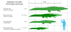 Adult females typically measure from 2.7 to 3.1 m (8 ft 10 in to 10 ft 2 in) in total length and weigh 76 to 103 kg (168 to 227 lb).[62][63][64] Large mature females reach 3.4 m (11 ft 2 in) and weigh up to 120 to 200 kg (260 to 440 lb).[65] The largest female on record measured about 4.3 m (14 ft 1 in) in total length.[40] Female are thus similar in size to other species of large crocodiles and average slightly smaller than females of some other species, like the Nile crocodile.[38] The saltwater crocodile has the greatest size sexual dimorphism, by far, of any extant crocodilian, as males average about 4 to 5 times as massive as adult females and can sometimes measure twice her total length. The reason for the male skewered dimorphism in this species is not definitively known but might be correlated with sex-specific territoriality and the need for adult male saltwater crocodiles to monopolise large stretches of habitat.[66][67] Due to the extreme sexual dimorphism of the species as contrasted with the more modest-sized dimorphism of other species, the average length of the species is only slightly more than some other extant crocodilians at 3.8–4 m (12 ft 6 in – 13 ft 1 in).[19][28][68]