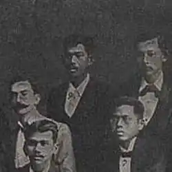 Filipino revolutionaries exiled to Hong Kong. Estrella is in the back row, flanked by Isabelo Artacho, Antonio Montenegro, Gregorio del Pilar, and Isidro Torres.